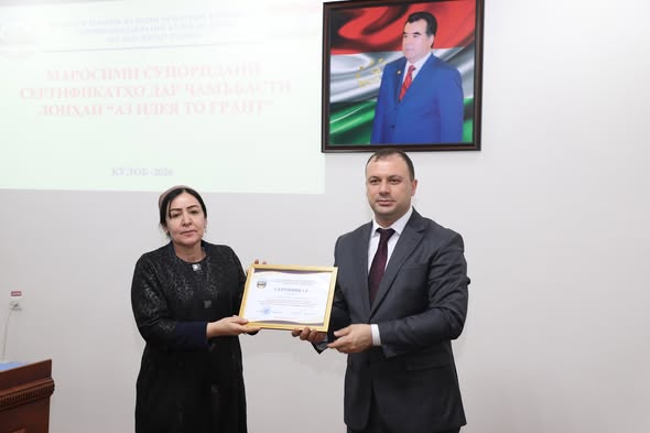 Имрӯз, 28.01.2026, дар Донишгоҳи давлатии Кӯлоб ба номи Абуабдуллоҳи Рӯдакӣ маросими супоридани сертификатҳо ба иштирокчиёни силсилаи семинарҳои омӯзишӣ таҳти унвони «Аз идея то грант» баргузор гардид.
